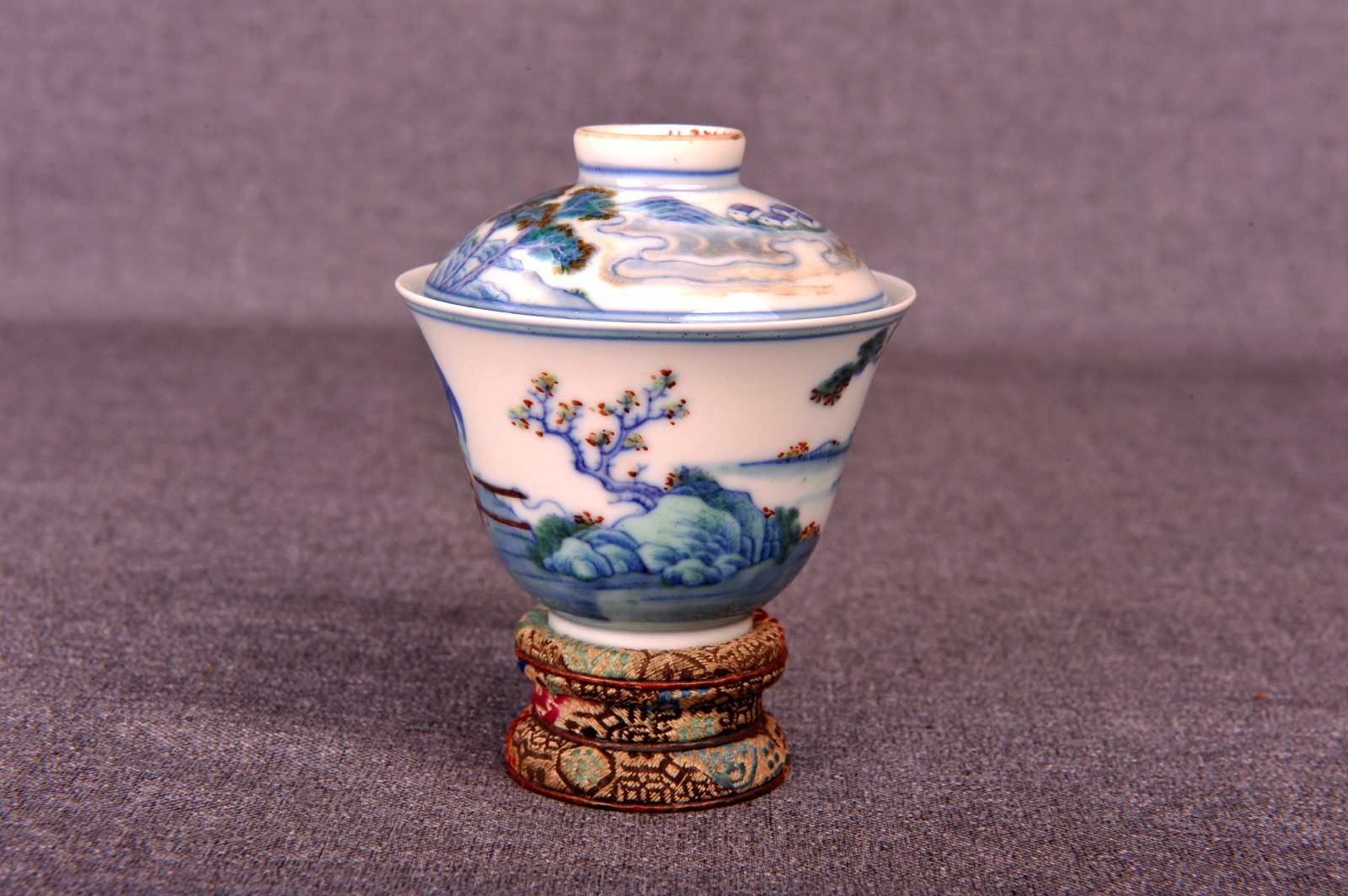1976年贵州省博物馆收购的“尘定轩”斗彩山水人物盖碗,通高6.8厘米,口径6.7厘米,足径2.7厘米。敞口,圈足,盖可作倒置小碟,盖顶圈钮。此盖碗体...