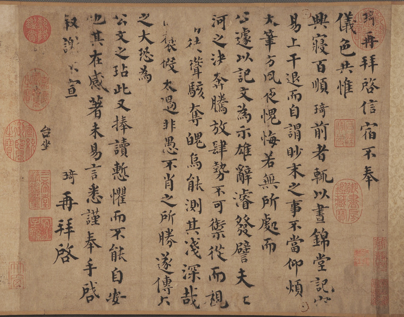 琦再拜启,信宿不奉仪色,共惟兴寝百顺。琦前者辄以《昼锦堂记》□易上干,退而自谓,眇末之事不当仰烦大笔,方夙夜愧悔,若无所处。而公遽以记文为示,雄辞浚发,譬夫□河之决,奔腾放肆,势不可御,从而视□□耸骇夺魄,焉能测其浅深哉。□褒假太过,非愚不肖之所胜,遂传□之大,恐为公文之玷,此又捧读惭惧, 而不能自安也。其在感著,未易言悉,