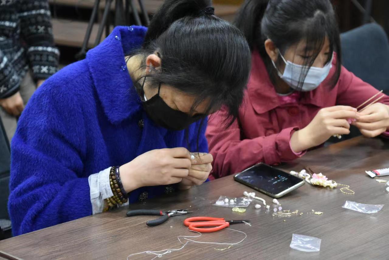 4月17日13:30,社教老师们开始分发制作发簪的材料。发簪零件、慢干胶、珠宝钳、铜丝被整齐地摆放在桌上,等待着开启它们的人。14:30活动正式开始,首先,社教老师讲述发簪相关文化知识、展陈文物杨氏土司墓群出土的金银器物及金凤冠;接下来“敲敲打打”开始组装起桌上零散的部件了。渐渐地,一支支粉色、金色、蓝色、绿色的发簪呈现在眼前。