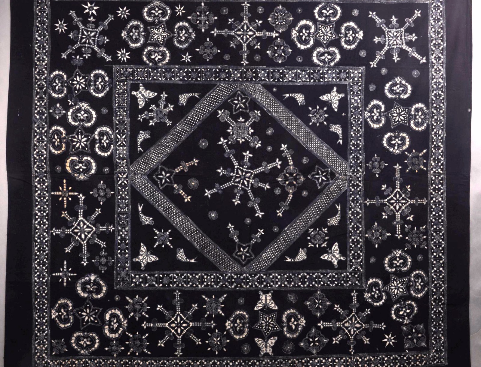 这块苗族蜡染垫单于1958年从贵州安顺市郊黑石头寨征集而来。