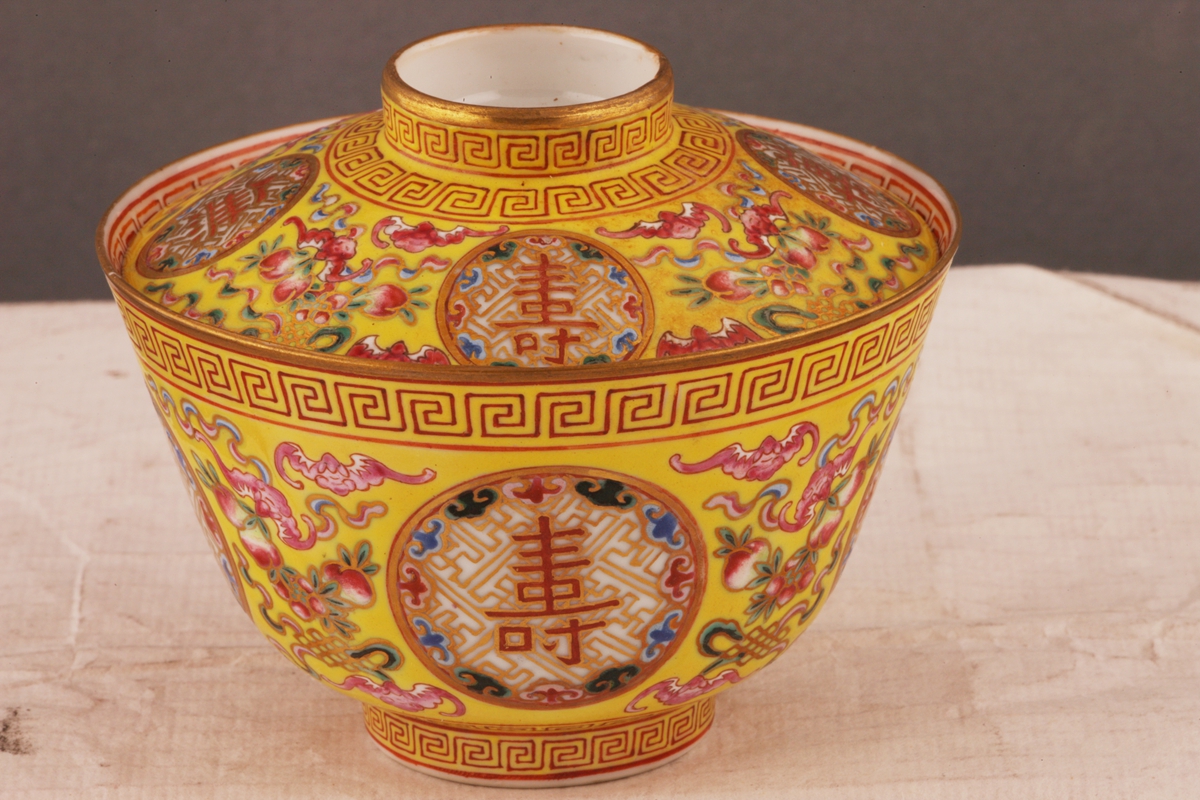 敞口,碗壁深直,圈足。以粉彩、金彩工艺彩绘纹饰,器盖、碗身各圆形开光四处,于万字锦地上书正楷“万寿无疆”。底书六字楷书款“大清光绪年制”。