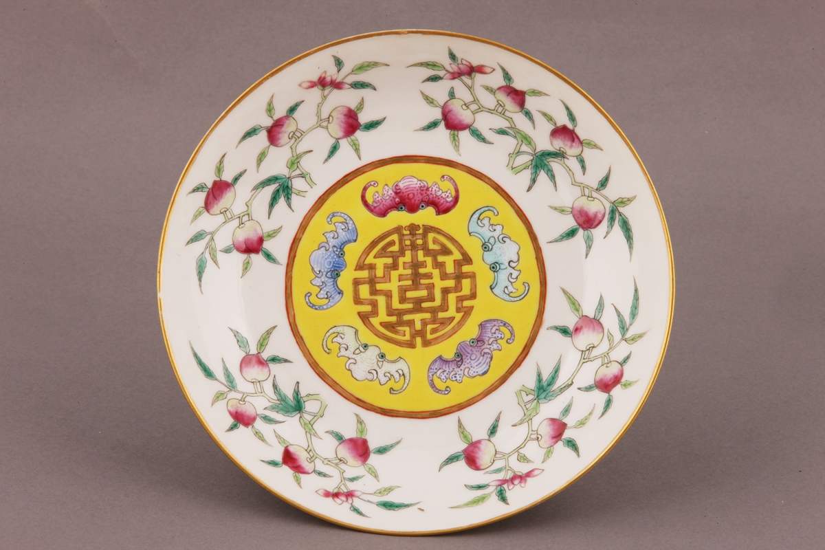 撇口,浅弧壁,圈足。盘内壁饰粉彩桃实,盘心饰金彩团寿、粉彩蝙蝠,组成“五福捧寿”图案,寓意祥寿。底书六字楷书款“大清光绪年制”。
