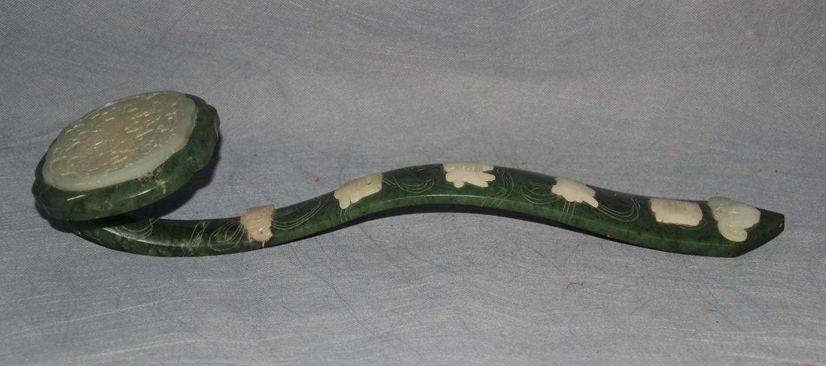 此如意青玉制,如意首、柄嵌白玉。如意首雕蝙蝠、牡丹,寓意富贵有福。如意柄刻绶带纹,首尾两只蝙蝠中嵌“吉祥如意”四字,寓意福寿吉祥。整碧玉料雕刻如意极少,此件文物为宫廷如意中极品,弥足珍贵。