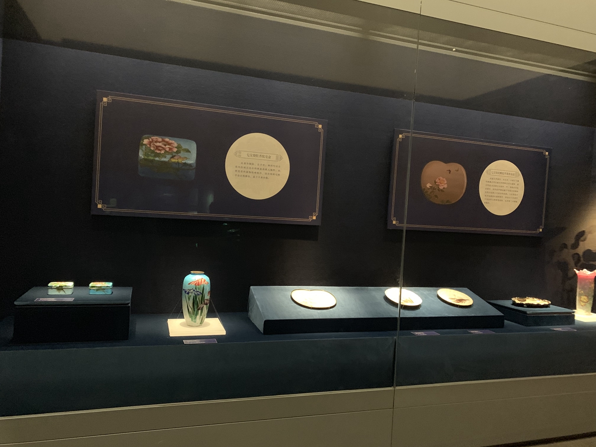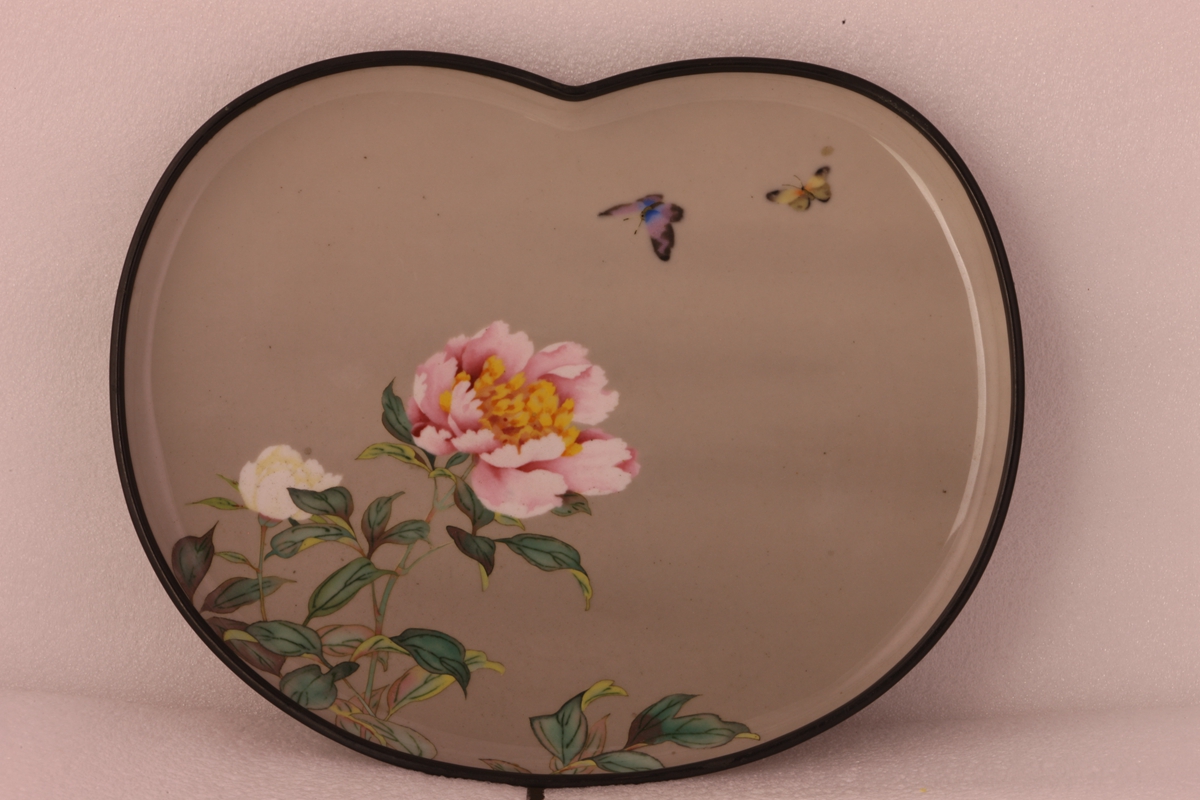 此盘为苹果形,米色底,以两只飞舞的蝴蝶及两朵盛开的的鲜花作为装饰,简洁明亮,花朵部分无掐丝,叶、茎部分可见金属丝,因此此件展品属于有线七宝烧和无线七宝烧工艺结合的成果。七宝烧是日本对金属珐琅器的称呼,即表示了在制作中添加的七种珍贵材料,也体现了对佛教的敬仰。