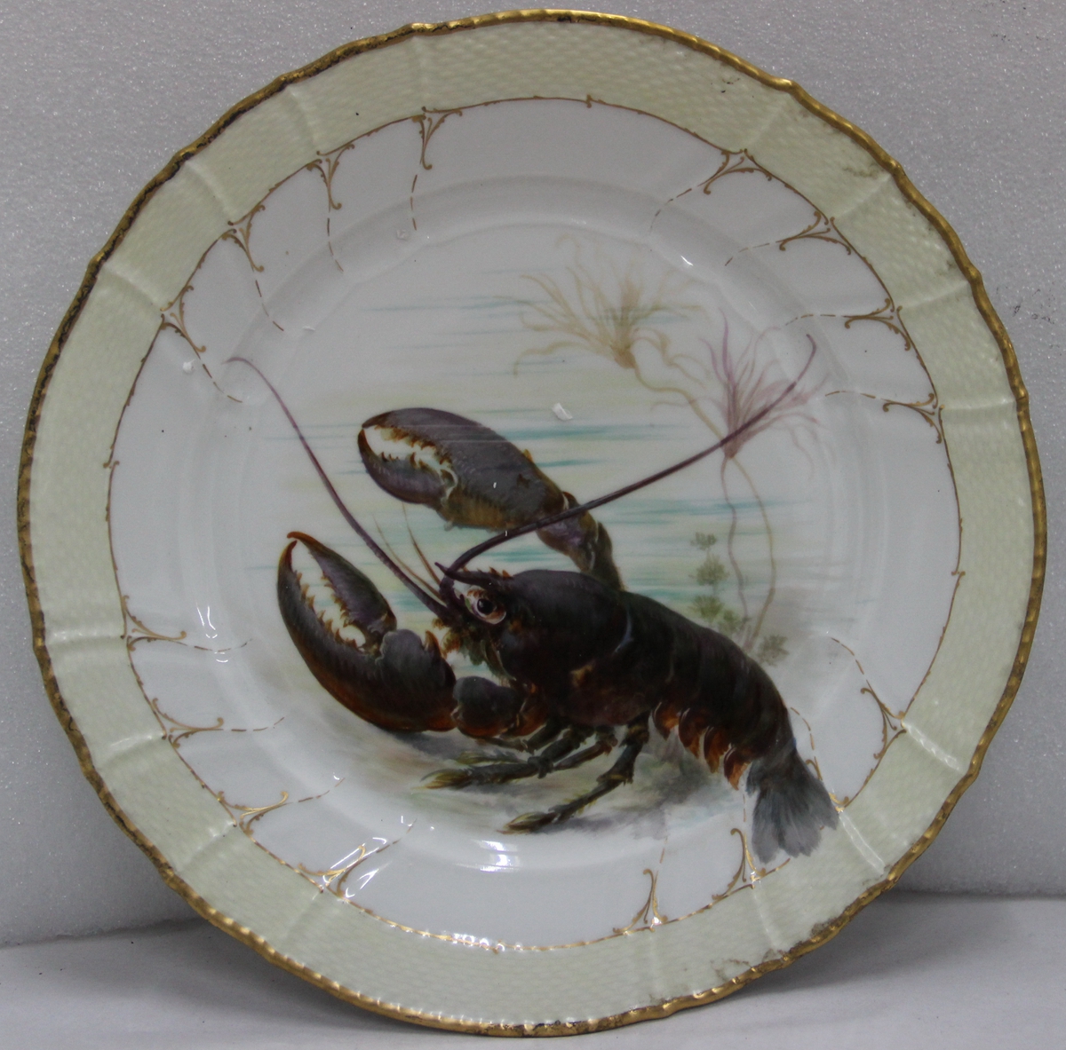 此盘口微撇,有描金花纹,弧壁,圈足,盘中绘有一龙虾为主体的图案,栩栩如生,底部带“KPM”字样商标。由德国“柏林皇家瓷器厂”制造。此厂距今已有250余年历史,创建于1751年,1763年普鲁士国王腓特烈大帝收购,还赐予了一尊宝石蓝色的君主节杖作为商标。