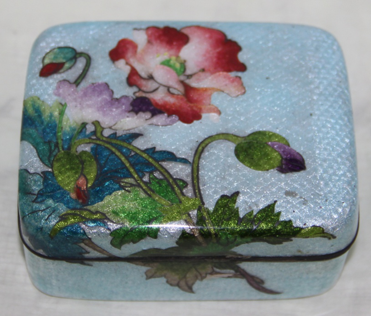 此盒为铜胎,长方形。制作时在白底先绘制出花卉的图案再填入釉料。此种类型的器物较难制作,因在烧制过程中会出现膨胀,盖子不易合拢。