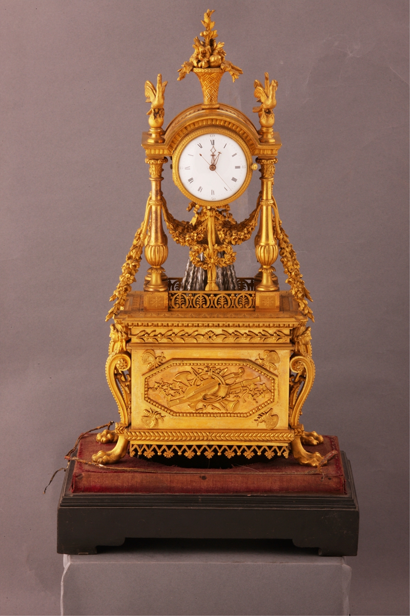 英国制造。钟体造型为欧洲古典风格,两根铜柱架起钟盘,钟盘下由紧密的玻璃柱组成水法景观,随着玻璃柱转动犹如一帘瀑布,瀑布四周由雕刻精细的铜镀金花叶支撑遮掩,花叶与瀑布虚实相间,宛若天成。钟壳为铜镀金,色彩艳丽、金碧辉煌。