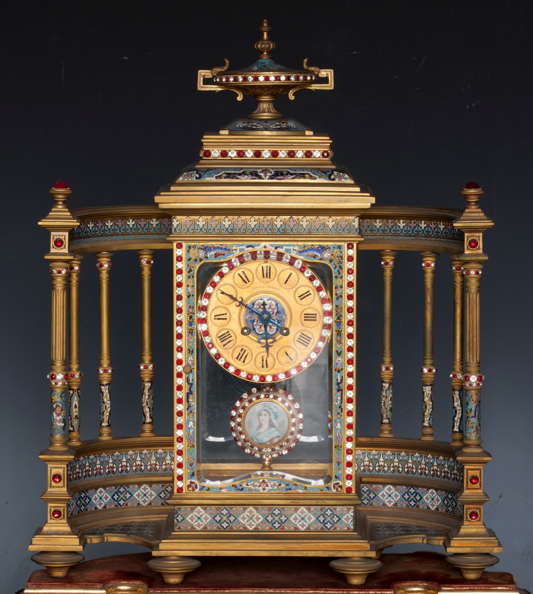 法国制造。铜镀金嵌珐琅水钻八柱围屏式钟,法国十九世纪。整体呈围屏式,左右各有四柱,中部呈方形亭式,表盘嵌水钻环绕一周,钟摆呈圆形嵌珐琅。该钟表色彩鲜艳,做工精致,在蓝色珐琅之中加以几何图案及花卉纹饰,大气中又显细腻。