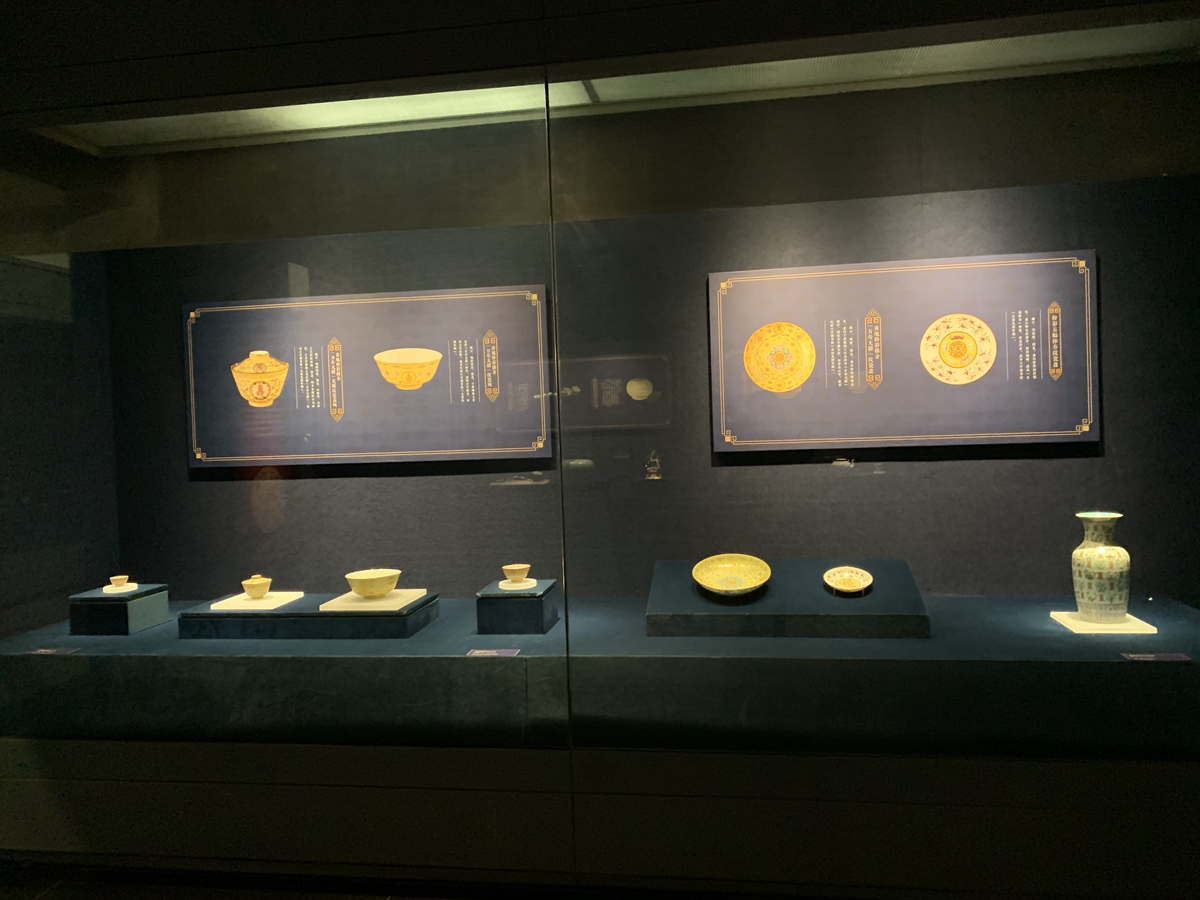敞口,弧壁,圈足。盘外壁饰缠枝花卉,盘内于黄釉地上以金彩书“万寿无疆”四字,间绘万字绵长纹、如意朵云等。底书红彩六字楷书款“大清光绪年制”。