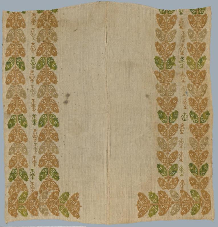 这件希腊的阔叶纹刺绣(见图4),纹样为同一叶纹沿布边缘两侧有序排列成对称L型,叶纹色彩有序变化,重复出现,好似橄榄枝叶,橄榄树象征着胜利,代表了希望。