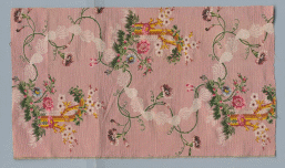 英国丝绸设计在18世纪40-50年代也出现了在平纹或菱纹地部上织满花卉图案的特点,相较法国的设计更趋向自然主义的发展。这一件粉地独幅花卉建筑纹挖花织物(见图7)由白色羽毛在织物形成一条S型的线条,石筑拱门和篱笆上缀满了红花绿叶,一派热闹景象。