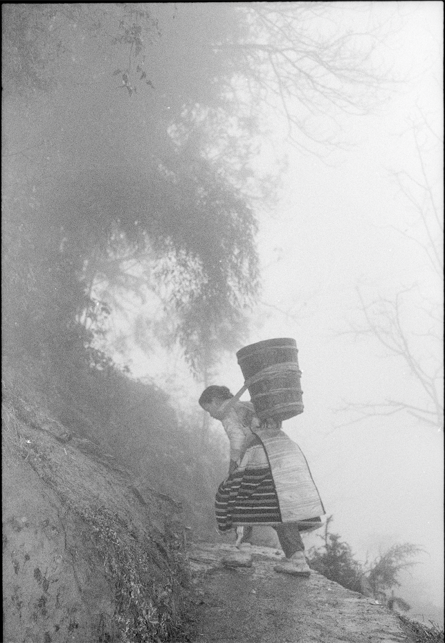 那时的陇戛寨,全村只有山下一口井,所有的生活用水都取自于井里。妇女们用木桶装水,用麻绳拴在腰间,倾斜着身体往山上背。一桶水大约五六十斤,在迷雾中,沿着山路一步一步艰难前行,这样的生活方式甚至成为箐苗的一种文化符号。1996年摄
