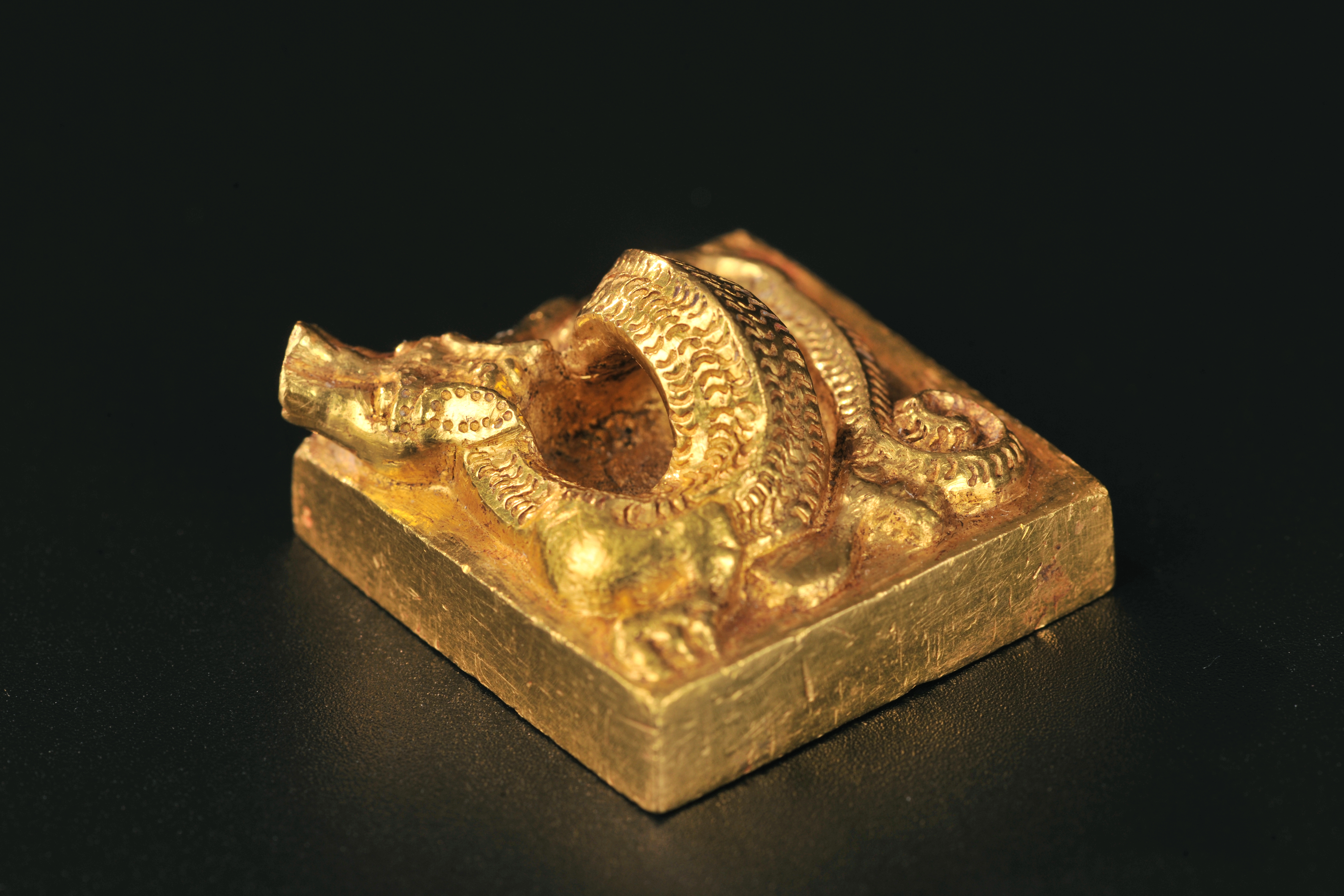 身份凭证。“文帝行玺”龙钮金印是我国目前考古发掘所见最大的一枚西汉金印,也是唯一的汉代龙钮帝玺。它打破了秦汉时期天子用玺以白玉为材料、以螭虎为印钮的规制,与先前发现的“皇后之玺”玉印和“皇帝信玺”封泥共同印证了史书记载的秦汉印玺制度。据史籍记载,汉初吕后时期,第一代南越王赵佗曾经僭号为“南越武帝”,其孙继位为第二代南越王后,僭号为“南越文帝”。第三代南越王婴齐不再僭号称帝,故“藏其先武帝文帝玺”。这枚金印出土于墓主人的胸腹部位,是墓主人身份最可靠的物证,意义重大。