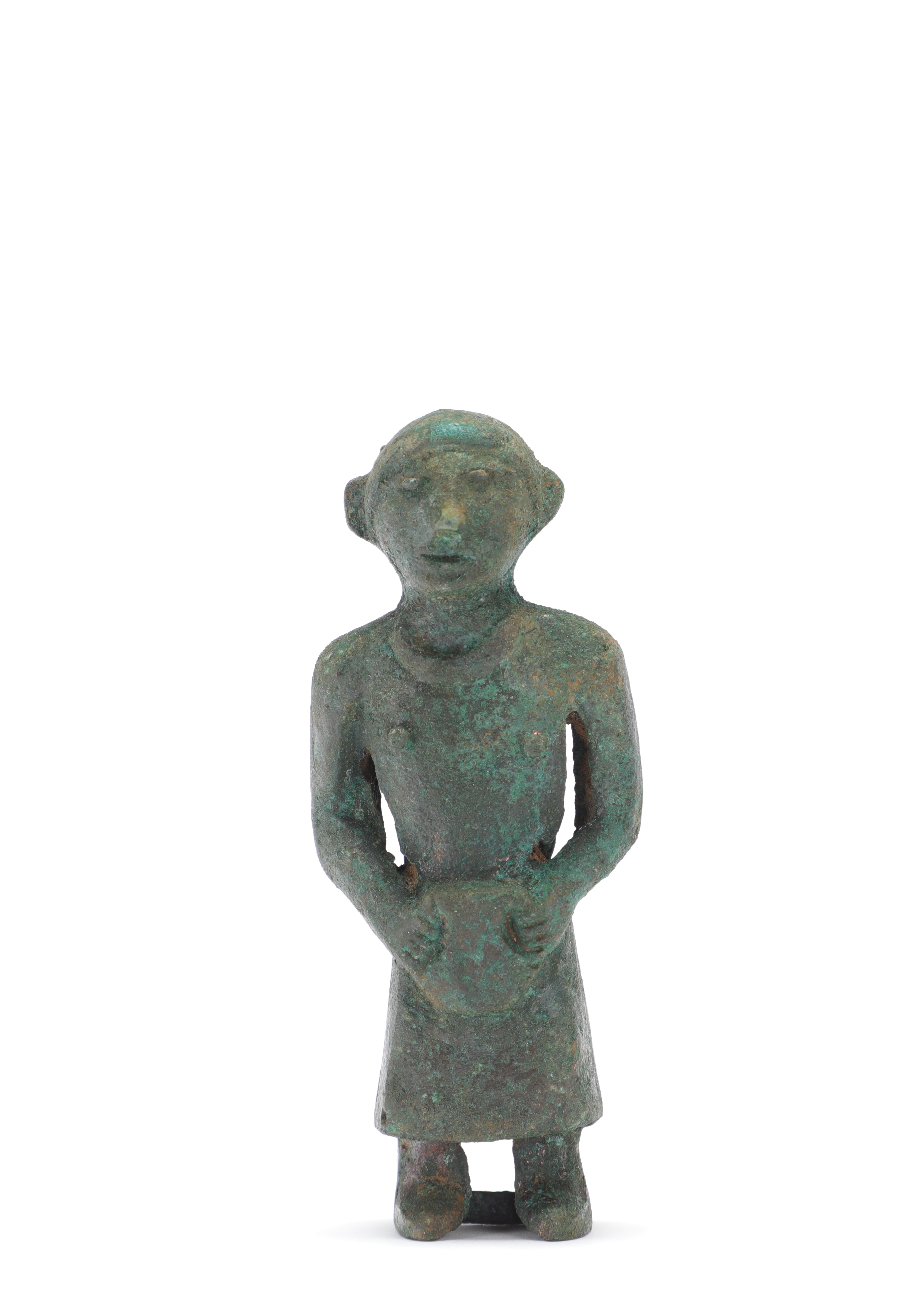 1.三人背水铜杖首:这件青铜杖首采用三人背水的独特造型,整体可分为銎部、平台和人物三部分。銎部呈规整的圆筒形,通体饰以精美的螺旋纹饰。銎部上方连接一个倒圆锥形平台,平台如竹节造型,节纹清晰。平台上三名女性呈“品”形站立,人物服饰统一:头戴尖顶小帽,身着紧身上衣,下穿及膝筒裙,裙面装饰刺绣纹样。三人各背一个敞口深腹平底水罐,背带从罐腹绕过,上端紧勒于前额。人物面部表情生动,相向而立,张口作讴歌状,整体造型富有动感和韵律美。